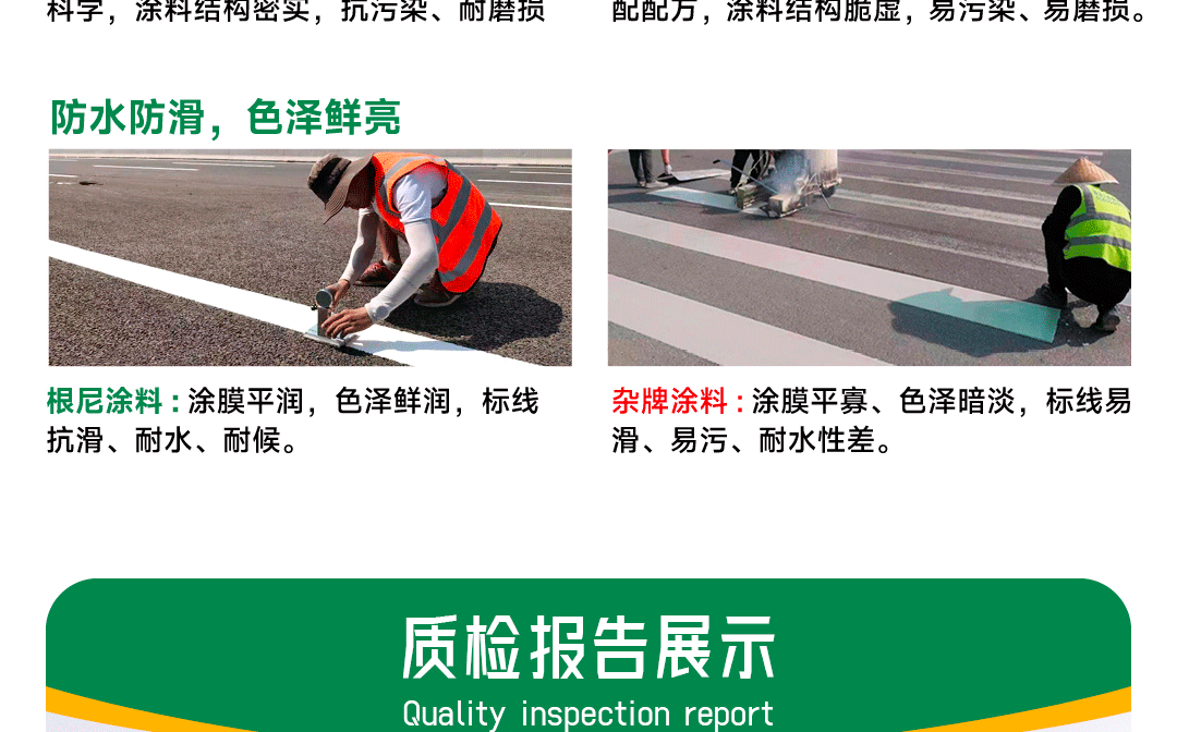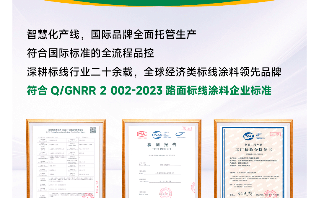 ?專家測評:涂料特點:結(jié)構(gòu)合理、混合均勻、質(zhì)量一致性高 / 玻璃珠含量少 / 用途廣泛,使用方便。執(zhí)行標準:中國交通部Q/GNRR 2 002-2023路面標線涂料標準;